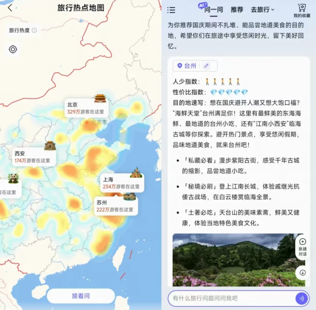比如“问一问”暑假上线了一个新功能:为用户推荐目的地时,提供“旅行热力地图”,实时显示人流热度。