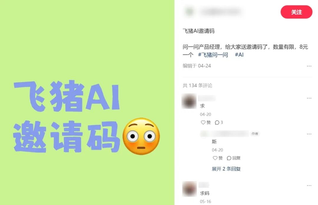 今年4月份,飞猪推出AI“问一问”时,尚在测试阶段的邀请码就一码难求,甚至在小红书被炒到99块一个。