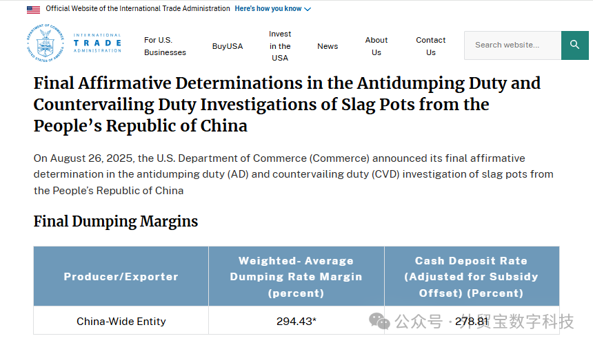 2025年8月26日,美国商务部发布针对中国产渣罐(Slag Pots)的贸易救济终裁结果。在反倾销调查中,美方认定所有中国生产商/出口商存在倾销行为,统一适用294.43%的反倾销税;扣除已征收的补贴保证金后,实际需缴反倾销保证金调整为278.81%。