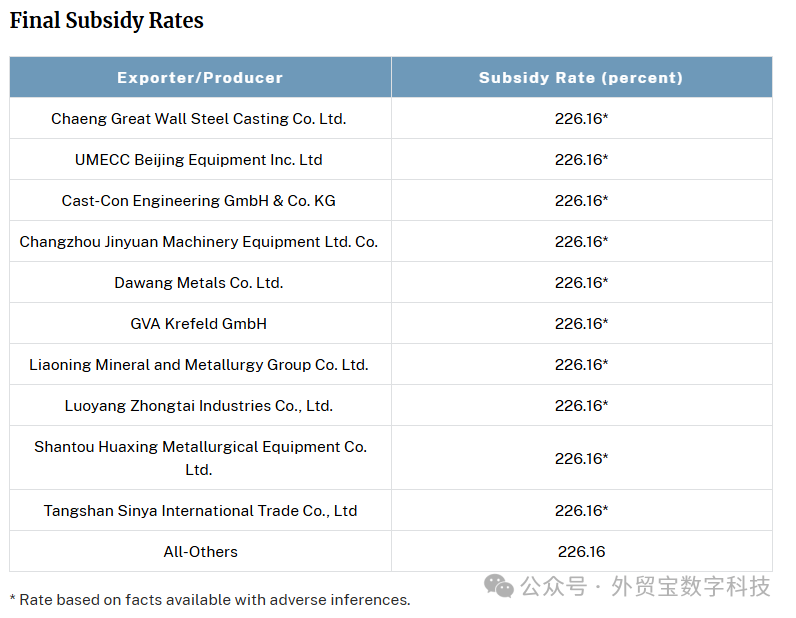 与此同时,反补贴终裁亦同步落地。美国商务部裁定,包括Chaeng Great Wall Steel Casting Co. Ltd.、UMECC Beijing Equipment Inc. Ltd.、常州金源机械设备有限公司、汕头华兴冶金设备股份有限公司等在内的多家中国企业,均获得226.16%的补贴幅度。