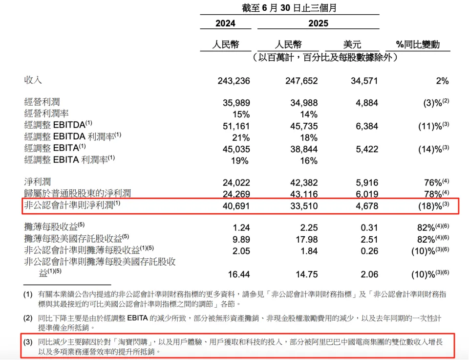 阿里方面,业务更庞大繁杂,财报统计口径变更,很难直接显示补贴影响。其2026财年第一季度(今年第二季度)财报显示,阿里中国商业分部经调整 EBITA 同比大降 21%,比去年同期少了103.64亿元。整个阿里集团经营活动产生的现金流量净额,相比去年同期整整少了129.64亿元,销售和市场费用同比增加了204.82亿元。通过这几个数字可以进行大致预估。