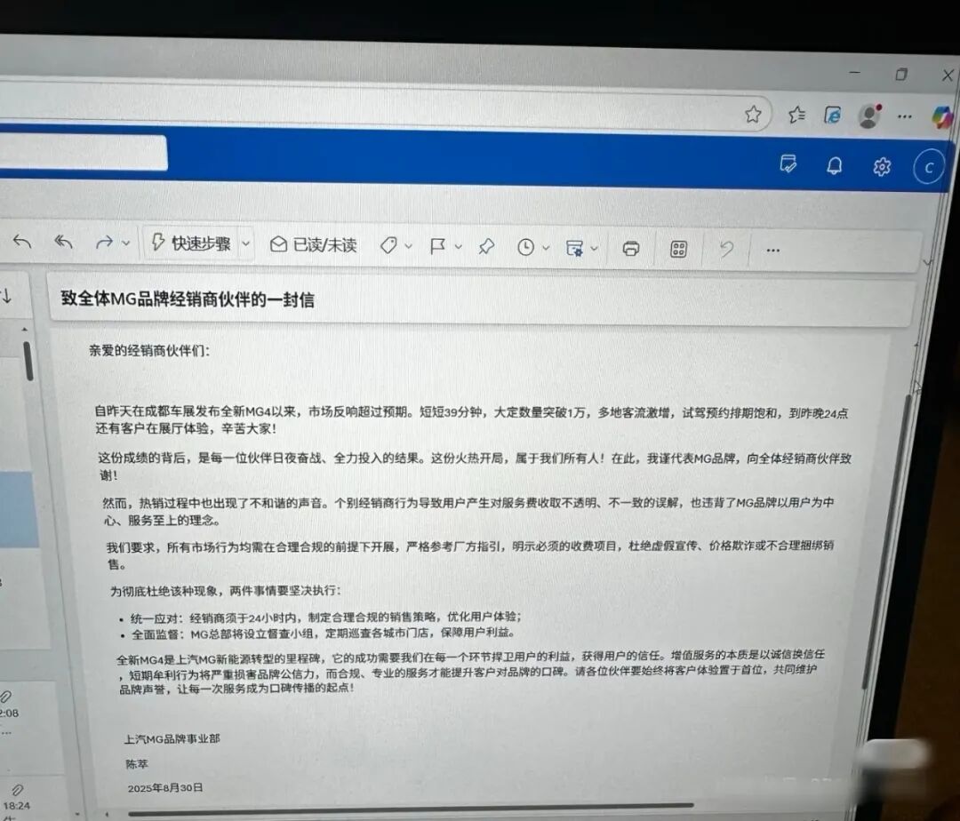 事实上,上汽MG也不希望经销商收取这些费用,8月30日,网传MG品牌经销商都收到厂家发的一封内部信,称个别经销商行为导致用户产生对服务费收取不透明、不一致的误解,违背MG品牌理念。