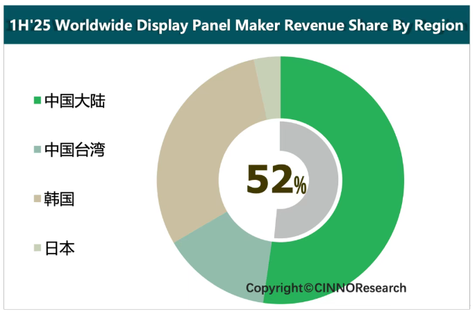 ▲图示: 2025上半年全球显示面板分区域营收份额,来源: CINNO Research
