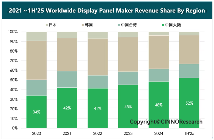 ▲图示: 2020~1H’25全球显示面板分区域营收份额变化,来源: CINNO Research
