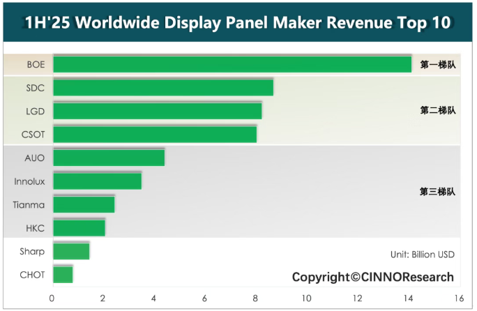 ▲图示: 2025上半年全球显示面板企业营收TOP10排名,来源: CINNO Research