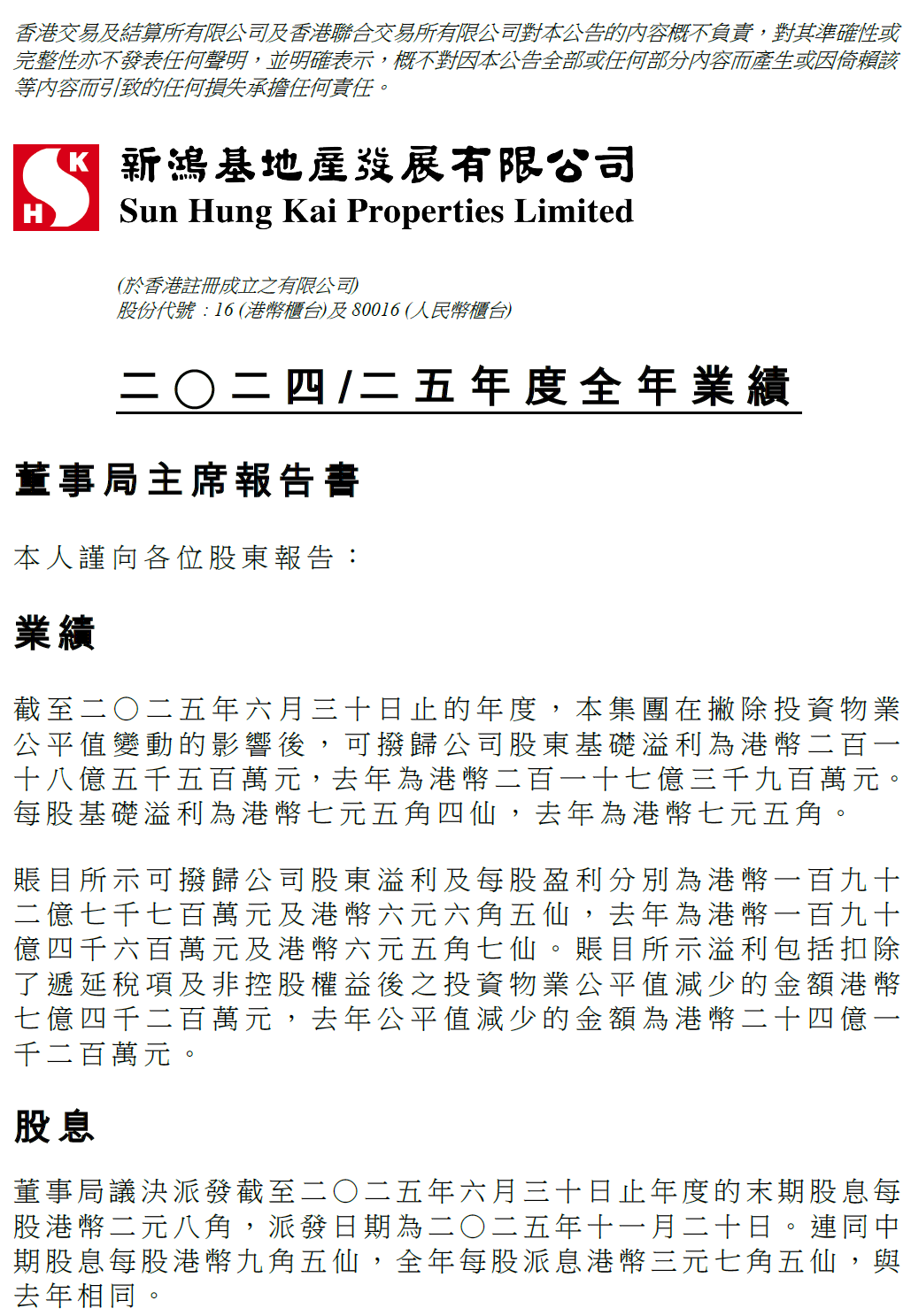 9月4日,香港地产龙头——新鸿基地产发布2024/25年度全年业绩。报告期内,公司实现总营业收入727.02亿元,同比增长8.8%;税前利润为225.73亿元,同比增长4.96%;实现净利润175.80亿元,同比增长1.21%。将于2025年11月20日派发截至2025年6月30日止年度的末期股息每股2.8港元。