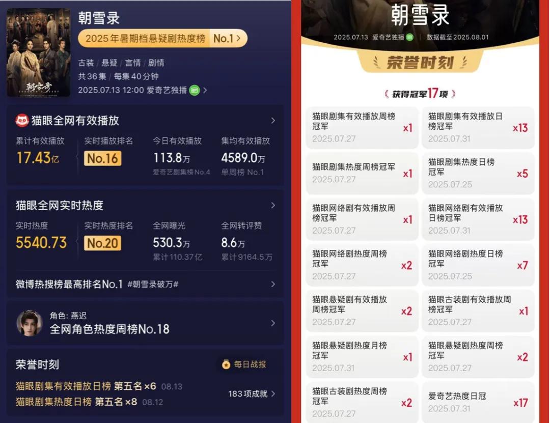 这种类型融合的创新尝试,使该剧成为暑期档最大的黑马——单日最高市占率达32.4%,单日正片有效播放量突破7000万,全网累计有效播放量超17亿。这些数据表明,观众对高质量的类型创新作品始终保持着热烈期待。剧集播出期间,“朝雪录剧情反转”、“李兰迪窒息感演技”等话题屡登热搜,观众对剧情走向和高光片段的热烈讨论也反映出其强情节设定成功激发了追剧热情。