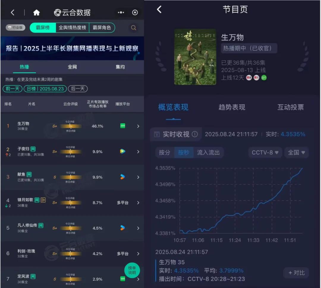 数据是最直观的证明:《生万物》在爱奇艺站内热度峰值突破11018,高居平台历史第二,仅次于《狂飙》;电视端表现同样耀眼,CVB收视峰值达2.806%,平均收视2.388%,拿下2025年央八收视年冠,并跃居央八历史总榜第二位,仅次于现象级爆款《狂飙》。此外,该剧创下近三年单日全端播放量纪录,云合单日播放量破亿,正片有效播放市占率峰值达46.1%,位列云合数据正片有效播放市占率历史第三,仅次于《狂飙》和《庆余年2》。这一切都清晰印证了其“台网双爆”的全民影响力。