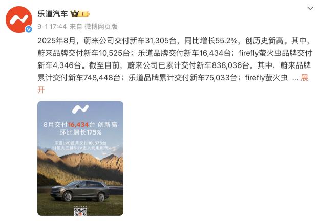 公开信息显示,2025 年 7 月份,蔚来公司交付新车 21017 辆;而到了 8 月份,在乐道新车 L90 的加持下,蔚来公司交付新车首次突破 3 万台,达到 31305 辆,同比增长 55.2%。