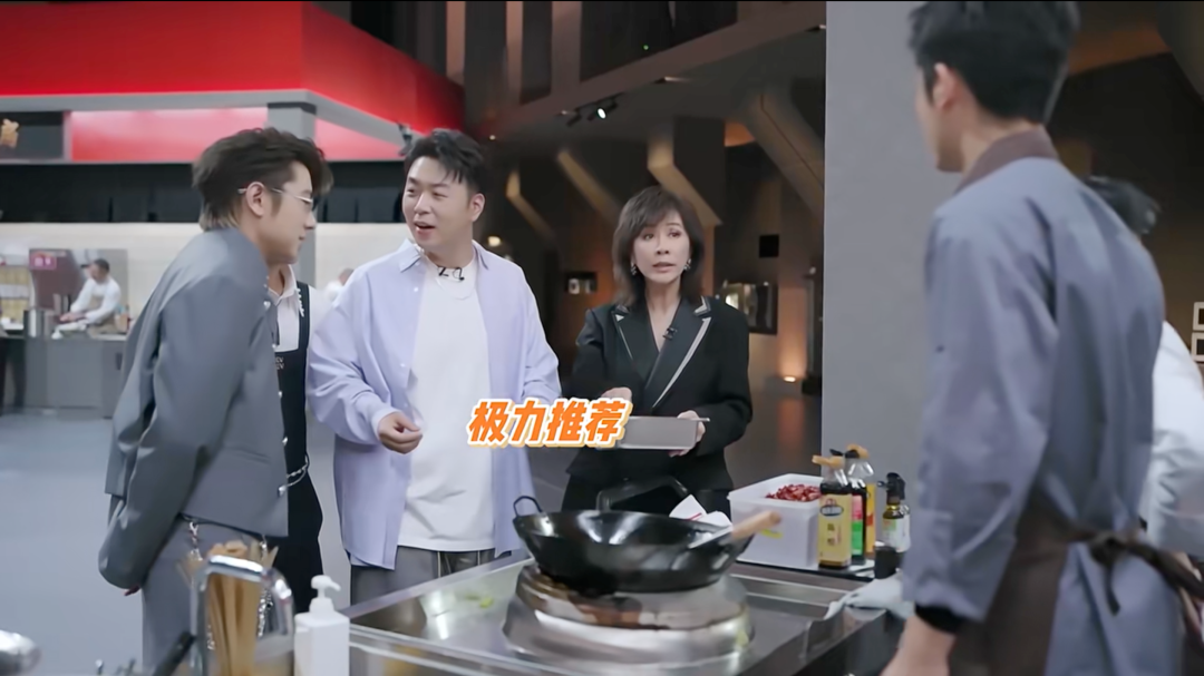 当刘嘉玲踩着十厘米高跟鞋、身着价值不菲的刺绣高定礼服、优雅地倚在料理台边,晃着香槟杯在充满浓郁的中式香料气息的厨房和厨师谈笑风生;当阿Sa手持自拍杆穿梭在食材摆放区与烹饪区之间,对着镜头分享“沉浸式探班”体验,某次甚至差点绊倒正在端着滚烫汤锅的厨师;杜海涛逮着空隙就讲段子,甚至在厨师正专注处理需要快刀细切的食材的时候让厨师手一抖,差点切到手指,不要说看节目的厨师了,但凡有过后厨经验的人都会感到非常不适……
