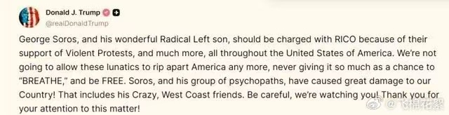 特朗普称我们不会让这些疯子把美国撕成碎片,甚至不给它一个喘息和自由的机会。索罗斯和他的精神病患者团伙对我们国家造成了巨大的伤害!这包括他在西海岸的疯狂朋友。