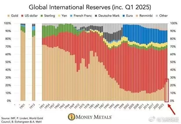 特朗普麻烦还包括美元正在失去作为主要储备货币的地位。它在全球储备中的份额下降了2%,至42%,这是自20世纪90年代中期以来的最低水平。黄金在第一季度增长了3%,达到24%,为30年来的最高水平