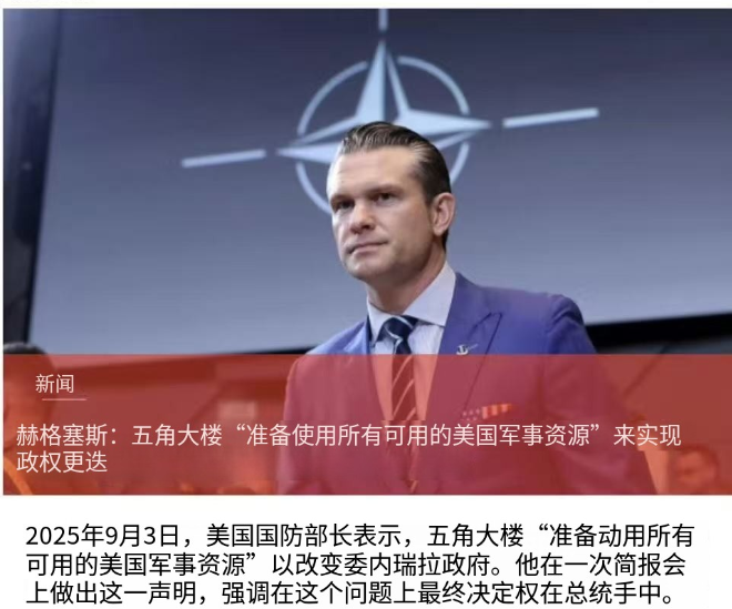 目前美国防长赫格塞斯也确实非常直白的表示:“准备动用所有可用的美国军事资源来实现委内瑞拉政权更迭。”