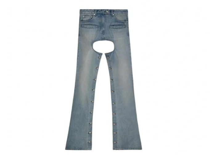 无独有偶,法国时装品牌courrèges,一反常态地镂空了牛仔裤的裆部。正当人发愁该穿什么内裤时,有人提议,“里面刚好穿Miu Miu的钻石内裤”。