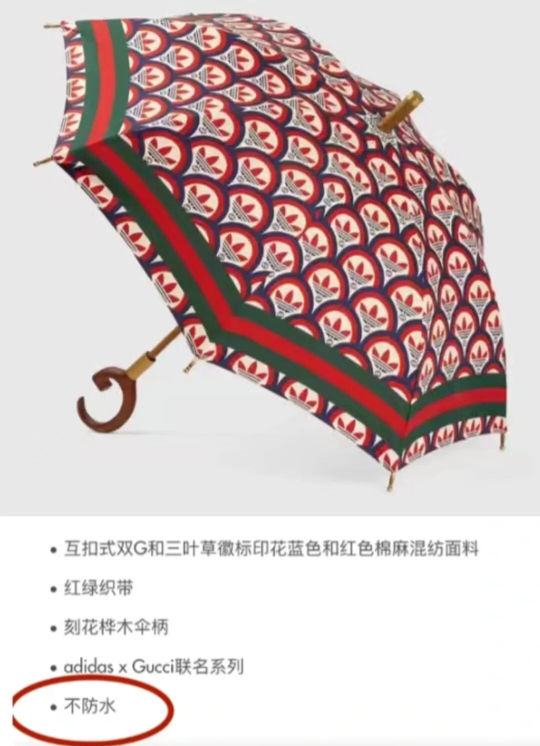 Gucci和Adidas曾联名发行一把售价上万元的雨伞,令人吃惊的是,商品的详情页上,明目张胆地标注着“不防水”。