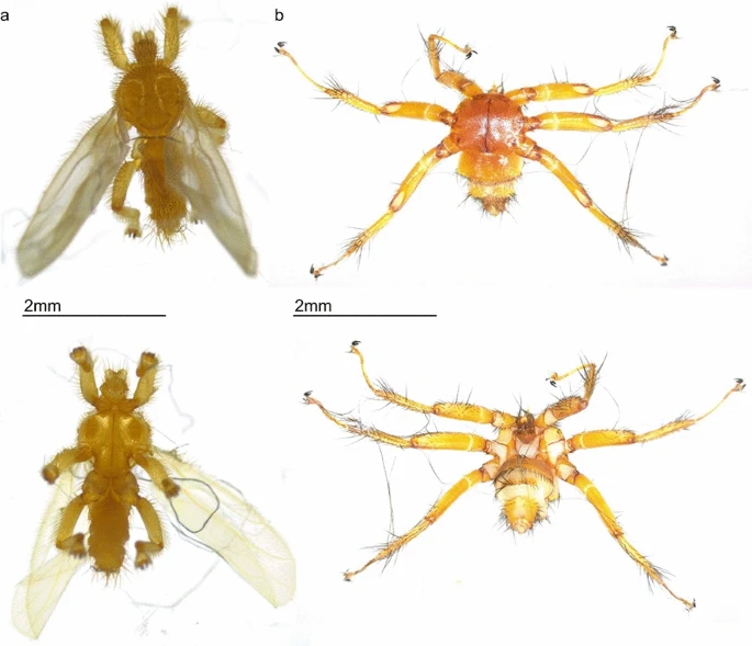 左边为Streblidae科,右边为Nycteribiidae科,可以看到有的有翅膀,有的没有翅膀,图源:参考资料[3]
