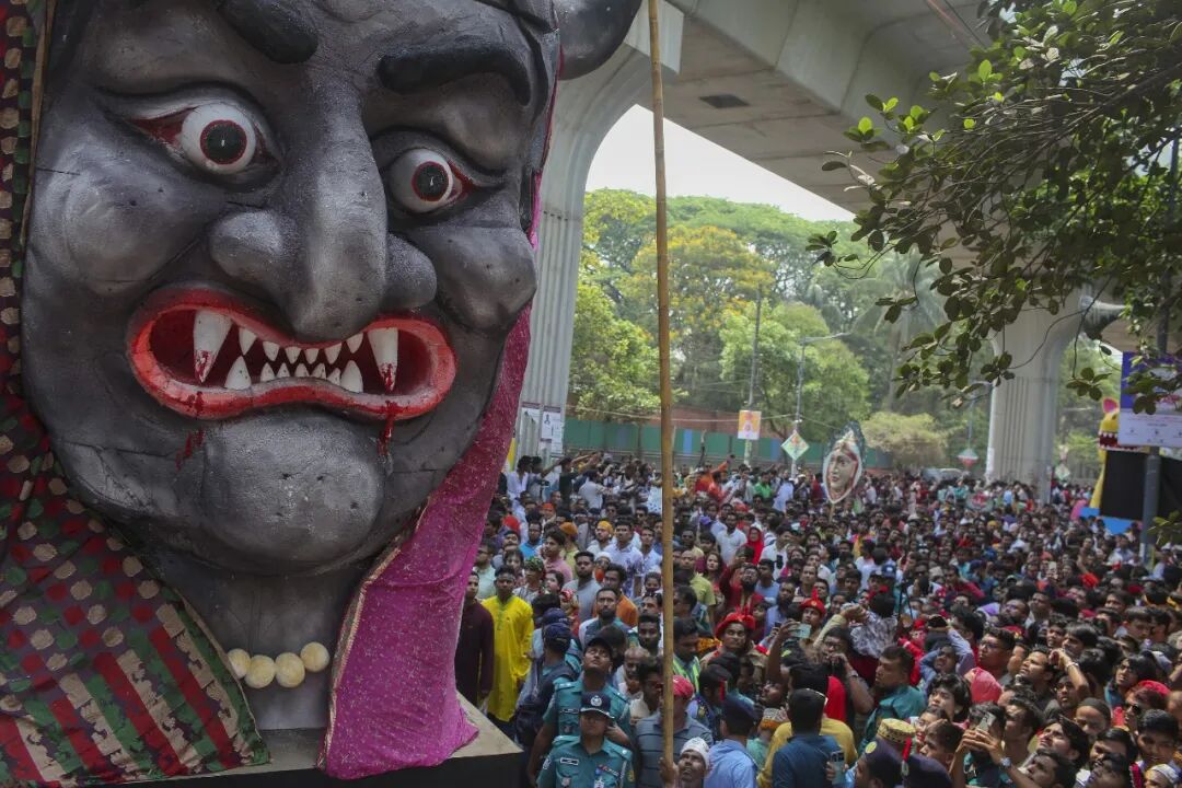| 当地时间2025年4月14日,孟加拉国达卡,孟加拉新年1432的庆祝活动中,谢赫哈西娜的图案出现在孟加拉新年游行中。孟加拉人民参与游行以庆祝孟加拉新年。