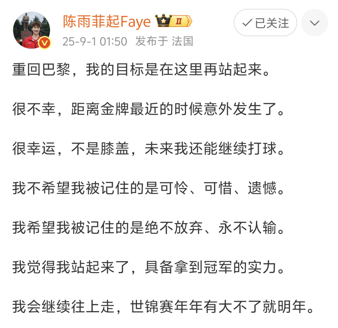 在半决赛强忍伤痛击退世界排名第一的安洗莹后,吃了8颗止疼药坚持上场的陈雨菲没能在决赛上如愿,而她距离生涯大满贯,只差世锦赛女单冠军。陈雨菲的泪水中,是不甘和遗憾。