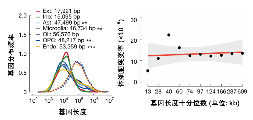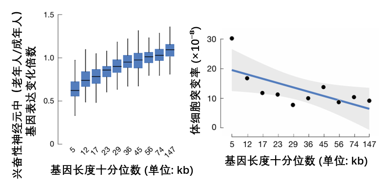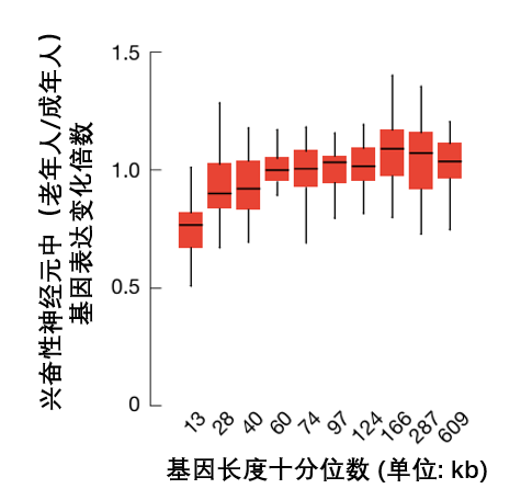 图注:在衰老中被下调的基因(实线)普遍比大脑中所有基因的平均长度(虚线)要短得多