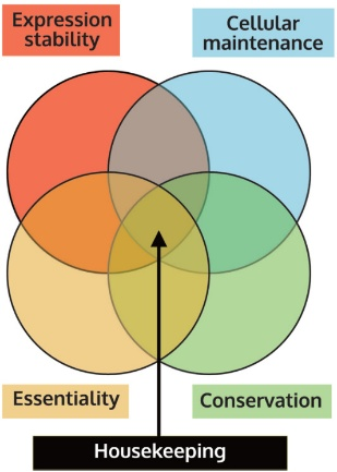 图注:严格来说,一个基因需同时满足四大核心属性,才能被定义为管家基因:表达稳定性(红)、细胞维持功能(蓝)、进化保守性(绿)和基因必需性(黄)