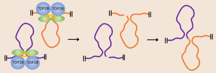 图注:拓扑异构酶(如TOP2B)通过“切断—穿过—重连”操作,动态地解开DNA的缠绕,保护转录过程
