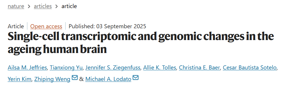 [1] Jeffries AM, Yu T, Ziegenfuss JS, Tolles AK, Baer CE, Sotelo CB, Kim Y, Weng Z, Lodato MA. Single-cell transcriptomic and genomic changes in the ageing human brain. Nature. 2025 Sep 3. doi: 10.1038/s41586-025-09435-8. Epub ahead of print. PMID: 40903571.