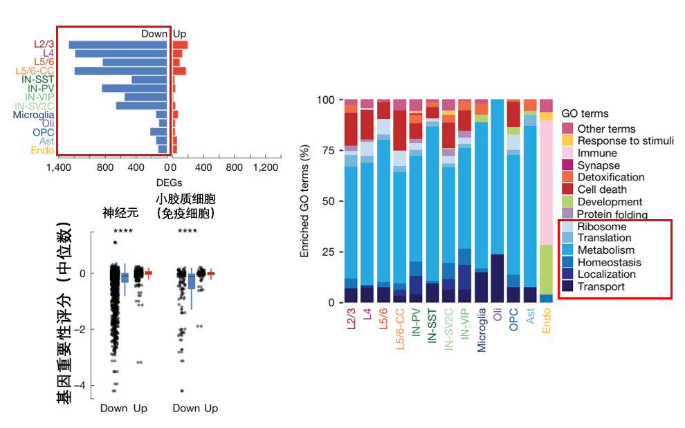 图注:在各类脑细胞中,衰老时活性下调(蓝色)的基因数量远超上调(红色)的基因,这些被下调的基因,其功能高度集中在维持基础生命活动的“管家功能”上(蓝色系)