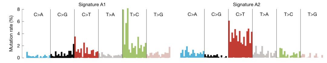 图注:这是一整套有规律的、系统性的突变模式,左边的突变模式以T>C(绿色)为主,右边则以C>T(蓝色)为主导