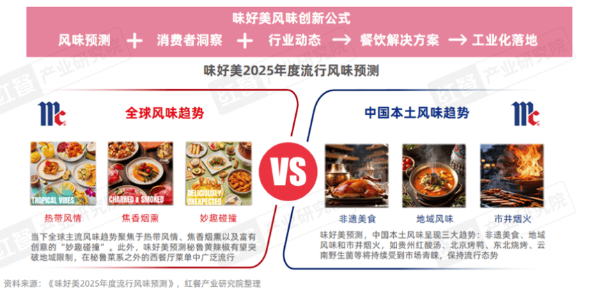 作为全球风味的领导者,味好美不仅为下游品牌提供丰富多样的风味产品,还积极拥抱大数据,主动洞察全球及本土市场的风味流行趋势,为品牌提供具有前瞻性的预测预判。据红餐产业研究院了解,味好美积极构建了风味创新公式和流行风味预测体系,以餐饮领域高质量大数据为基础,持续输出未来3至5年的流行风味预判,为餐饮品牌赋能。