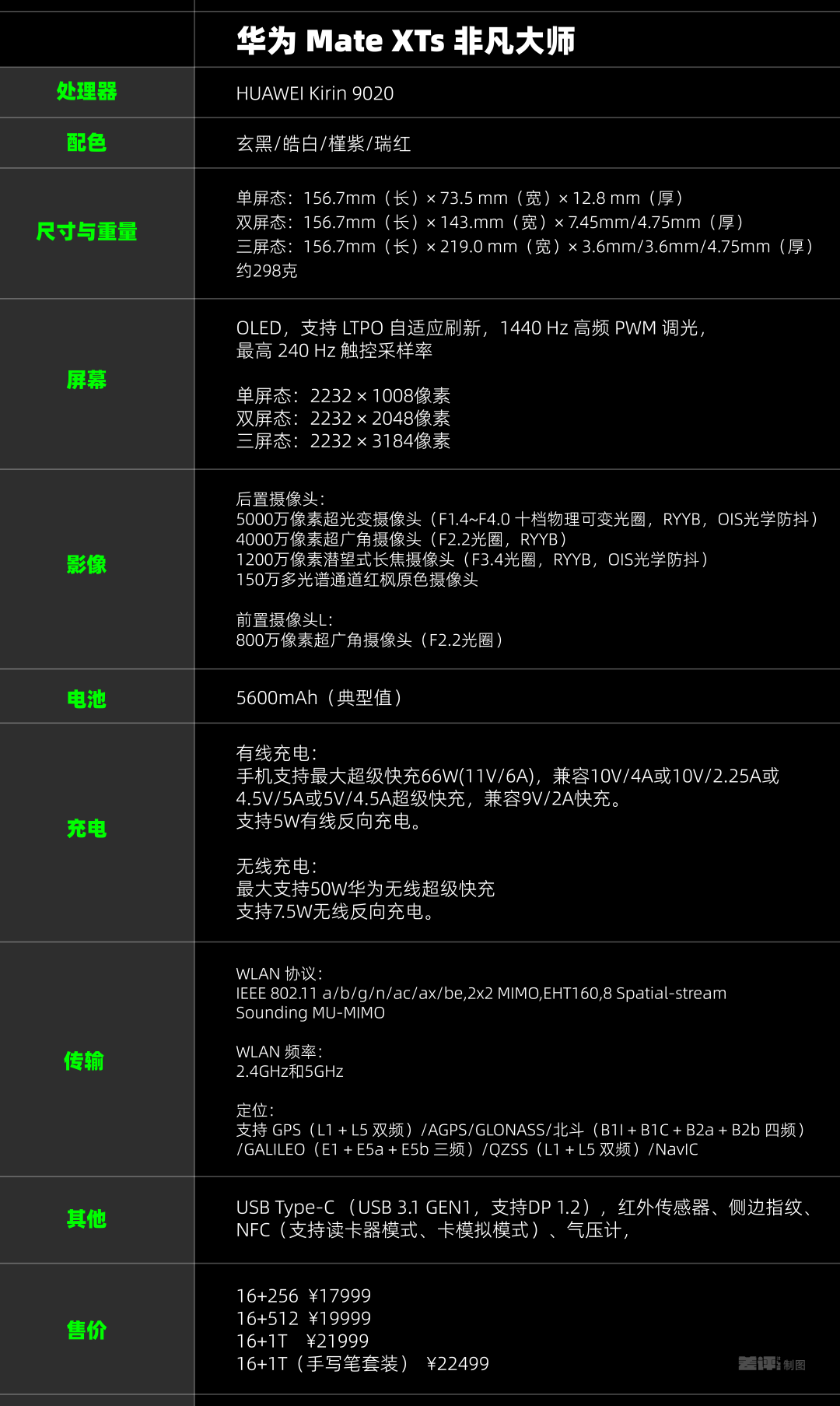 相比之下,Mate XTs 在其他硬件上的升级就显得没那么 “ 开创性 ” 了,更多的都是性能方面 “量的提高”,没有太多形态上 “ 质的飞跃 ”。