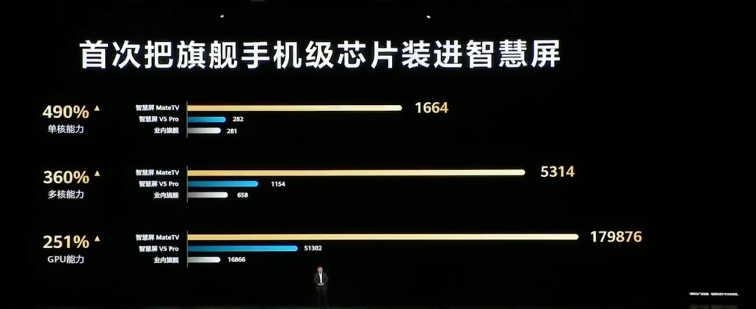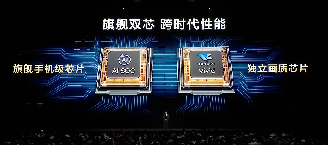 虽然没有说这颗 SOC 的型号是多少,但是我们余总非常大方地给我们展示了它的性能水平,于是在 2025 年,我们终于在发布会上看到厂商吹电视的性能跑分了。