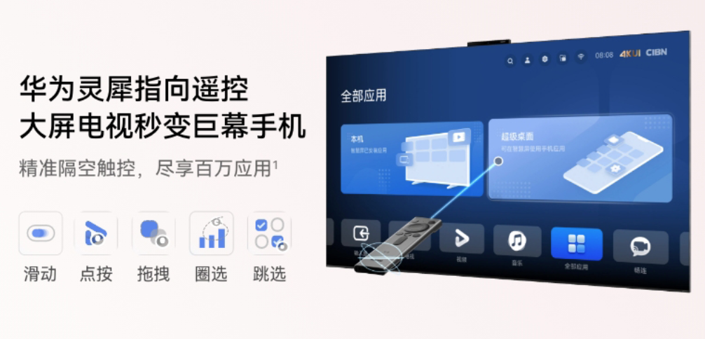 众所周不知,华为智慧屏这个产品线一直都以交互创新著称,尤其是它的遥控器,可以直接在屏幕上投射一个小光标做到指哪打哪。它甚至还能滑动,能点击,能长按,让智慧屏非常像是一台巨幕手机。