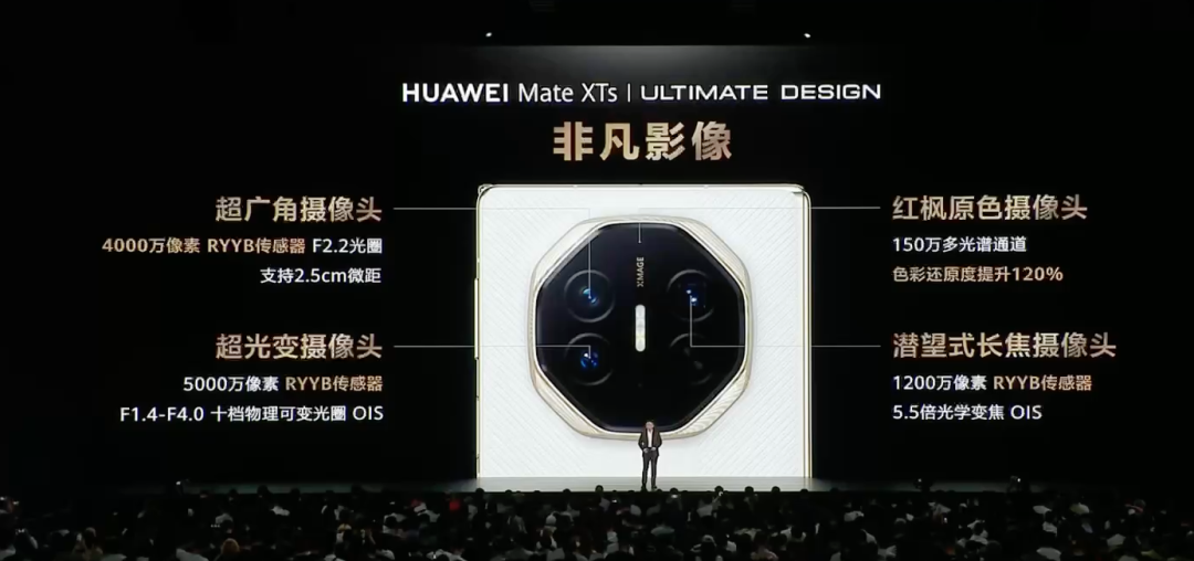 Mate XTs 在上一代三摄的基础上,给超广角摄像头也安排上了进光量更高的 4000 万像素 RYYB传感器。