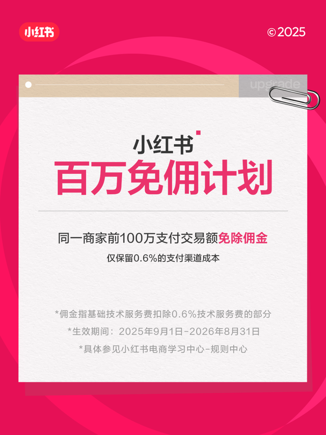 8月底,小红书电商为降低商家运营成本,发布了“百万免佣计划”,宣布2025年9月1日至2026年8月31日期间,同一商家的前100万支付交易额仅保留0.6%的技术服务费,基础技术服务费其余部分均免除。这一举措,无疑会吸引一大批商家入驻,进一步推动小红书的商业化转型。