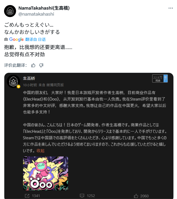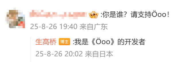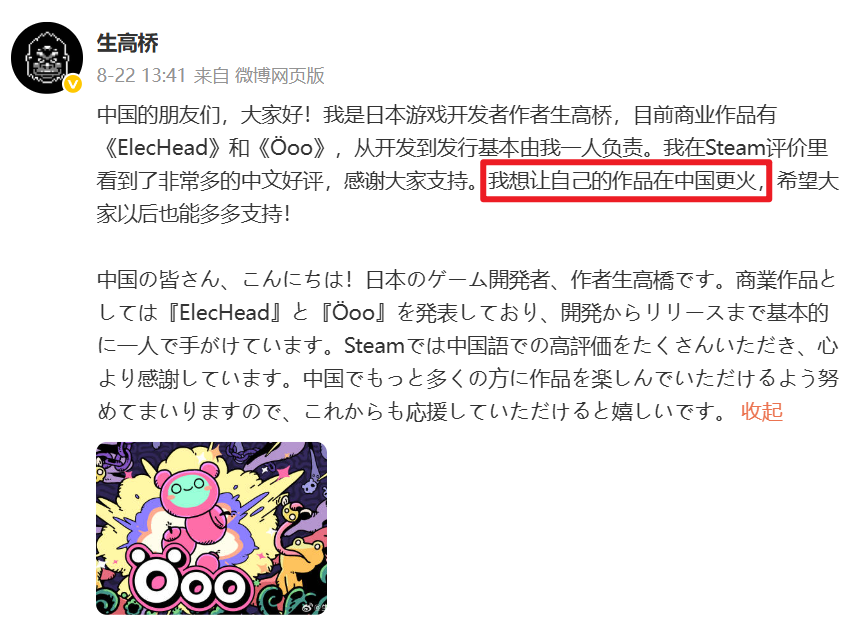 《Öoo》的作者生高桥,在游戏发售后不久,便察觉到了中国市场的潜力。8月22日,完全不懂中文的他专门注册了微博账号,在机翻的帮助下,他写下了自己来到中文社区的理由: