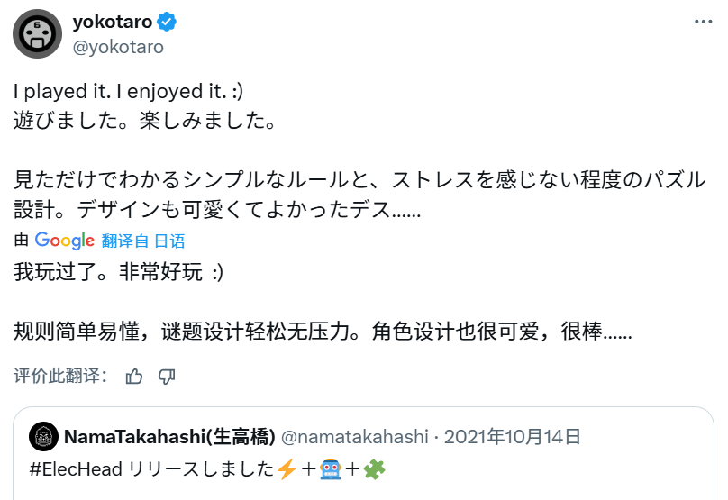 在《ElecHead》发布之后,生高桥的能力得到了部分业内人士的赏识。打造了《尼尔》系列的明星制作人横尾太郎,以及IGN满分独立游戏《蔚蓝》的开发者Maddy Thorson,都对这部作品赞不绝口。