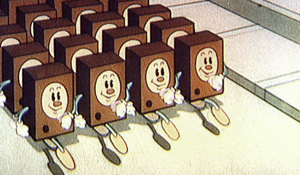 比如在一部叫做**《米格斯豪森的战斗》**(Die Schlacht um Miggershausen,1937)的宣传短片中,就可以看到创作者模仿迪士尼的造型和动作,塑造了一群拟人化的收音机形象。这些收音机像一支正规的军队一样迈着整齐划一的步伐,进入到德国乡村的家家户户,成为推动农业现代化的宣传主力。
