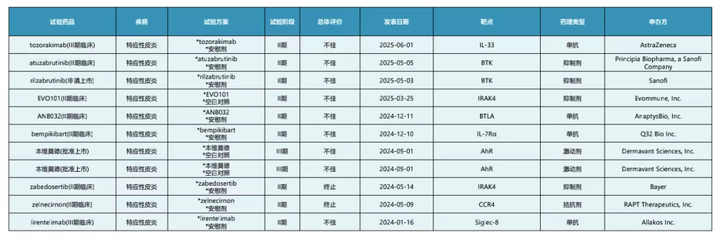 只是现实往往更残酷——对很多挑战者来说,第一步“越过度普利尤单抗”就已难以实现,更遑论第二步。尽管近年来中至重度特应性皮炎的生物制剂疗法进展颇多,但如下图所示,2024年以来特应性皮炎领域的失败案例,覆盖了不少自免新老靶点。