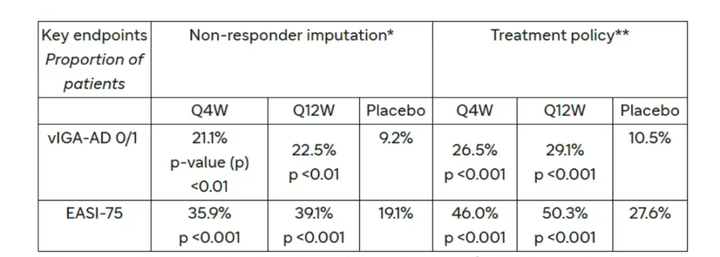 最终的结果如下图所示,从无应答者填补角度(包括在第24周之前使用过抢救/禁用药物且数据缺失的患者)评估,Amlitelimab(Q4W)组、Amlitelimab(Q12W)组和安慰剂组达到vIGA-AD 0/1的患者比例分别为21.1%、22.5%和9.2%,达到EASI-75的患者比例分别为35.9%、39.1%和19.1%。