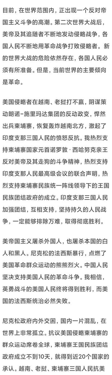 2. 雄文开篇定调:“目前,在世界范围内,正出现一个反对帝国主义斗争的高潮”。2025年,美国对全球发起关税战、全球多国领导人齐聚北京共赏历史最强阅兵式的背景下,这句话非常合适。美帝国主义,这就是定性。在经济贸易上,美国就是侵略者,赤裸裸欺负全世界穷国弱国,违背WTO确立的“富国照顾穷国”的精神。美帝不是孤家寡人,也有走狗,经常开会商议如何镇压全球反抗。