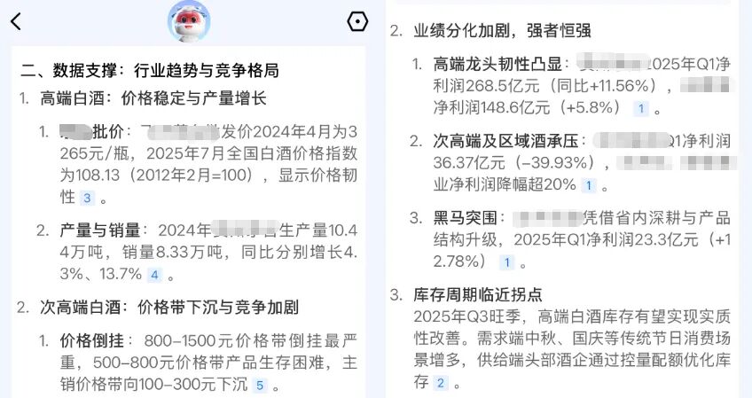 后续分析中,系统先结合消费场景变化,梳理出白酒行业“头部集中、高端稳定”的格局;再引入业内企业最新财务数据,并纳入近期中秋国庆旺季对终端销量的潜在影响;最终得出“高端稳、次高端分化”的结论,整体分析逻辑清晰且论据充分。