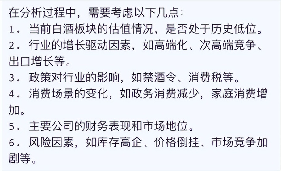 为验证其实际能力,我们向其提出了一个具有多维度分析需求的问题——“白酒板块具备哪些投资价值?”,该问题涉及宏观经济、行业格局、企业财务等领域,可综合考察其知识储备与分析能力。