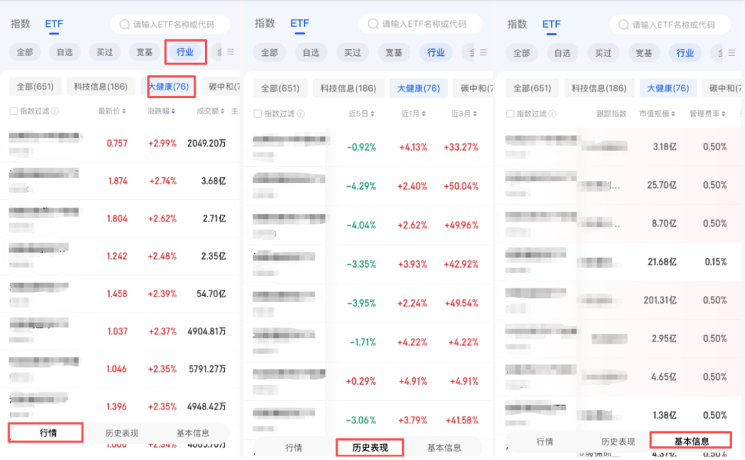 以上半年表现较好的医药行业为例,在ETF浏览器点击“行业”标签,系统会展开细分领域;选择“大健康”后,可即时筛选出76只备选ETF。用户能直接查看实时行情,历史业绩、跟踪指数、市值规模、管理费率等核心信息也可点击获取,无需跳转多页面整合。