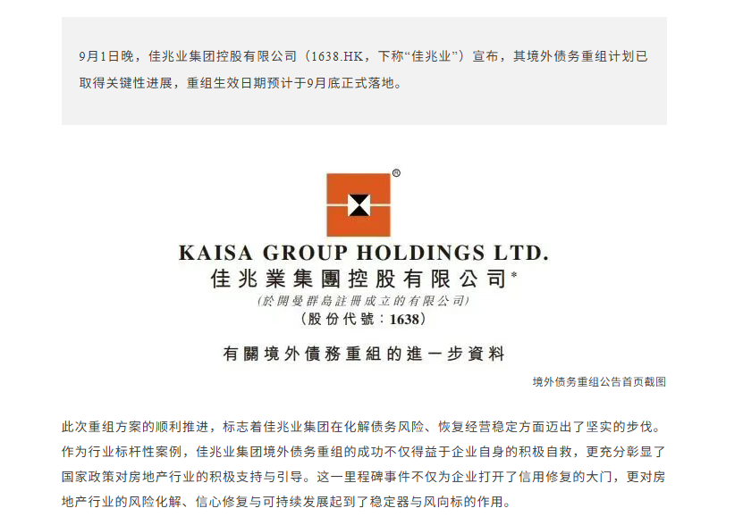 9月2日,佳兆业宣称,公司境外债务重组计划已取得关键性进展,重组生效日期预计在2025年9月底正式落地。