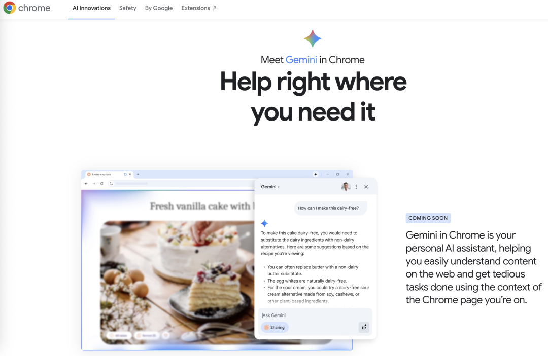 但值得注意的是,像谷歌这样的巨头,已经计划在 Chrome 里引入市面上的类似功能,比如允许用户直接在地址栏与 AI 助手对话,询问网页内容信息等。在谷歌官网的产品页面里,部分功能已经标明了「即将推出」的信息。