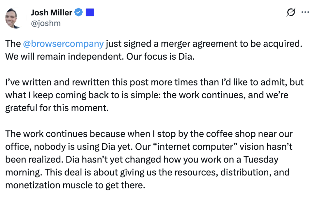 6.1 亿美元的收购价,与该公司去年 5.5 亿的融资估值几乎持平,没有非常多的溢价。但在 The Browser Company 首席执行官 Josh Miller 的说辞里,他似乎认为被 Atlassian 收购并非「卖身」,而是换来全球化的分发渠道与资源,确保 Dia 不至于在巨头夹击下边缘化。