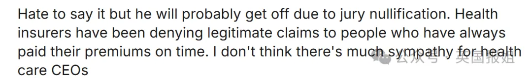 “说来惭愧,他很可能因陪审团裁决而脱罪。健康保险公司一直在拒绝那些按时缴纳保费的人提出的合理索赔,我认为医疗保健公司的CEO们不会得到多少同情。”