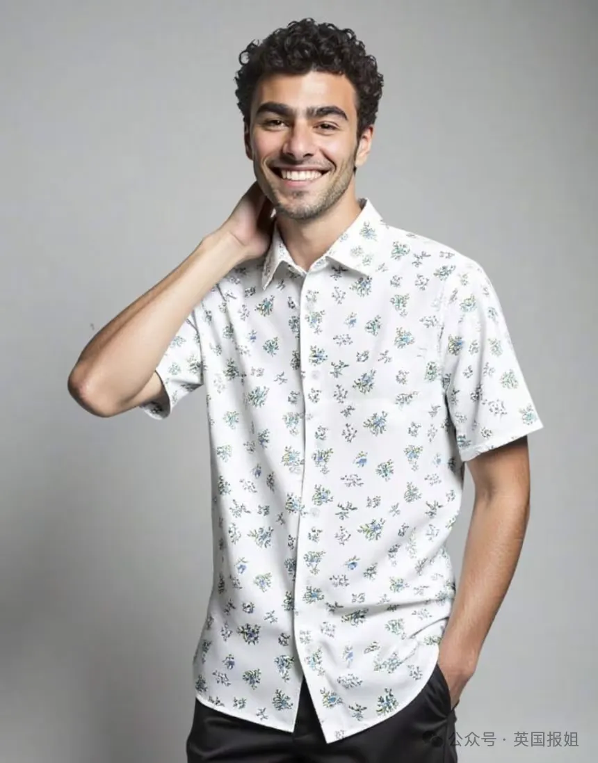 照片中的他穿一身白色花衬衫笑容灿烂,和他爆火后被抓拍到的“深沉忧郁风”判若两人。
