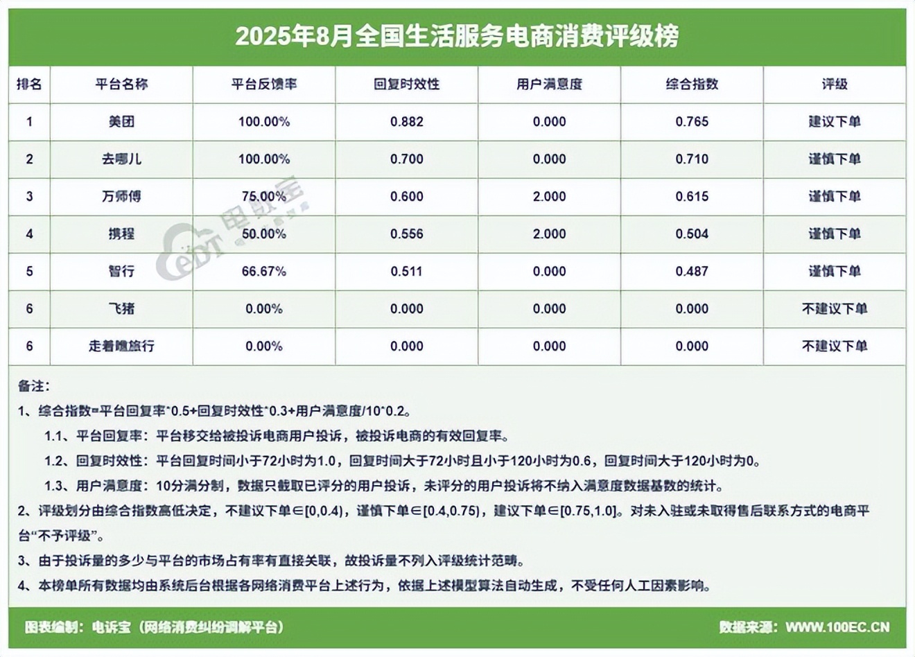 在8月全国生活服务电商评级榜中:获“建议下单”的有:美团共1家;获“谨慎下单”评级的有:去哪儿、万师傅、携程、智行共4家;获“不建议下单”的有飞猪、走着瞧旅行共2家。