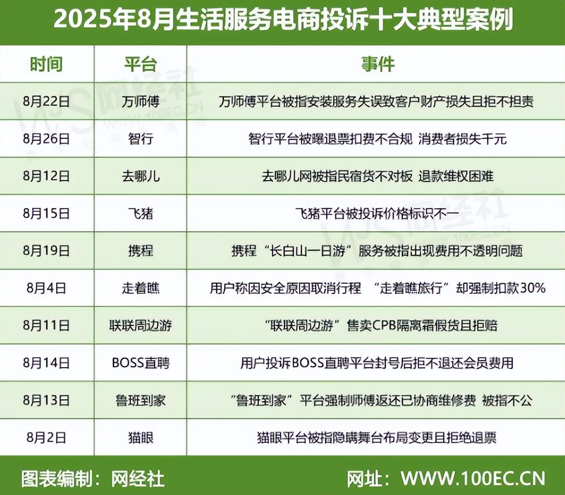此外,入选《2025 年8月生活服务电商十大典型投诉案例》的有:万师傅、智行、去哪儿、飞猪、携程、走着瞧、联联周边游、BOSS直聘、鲁班到家、猫眼。